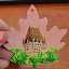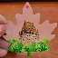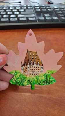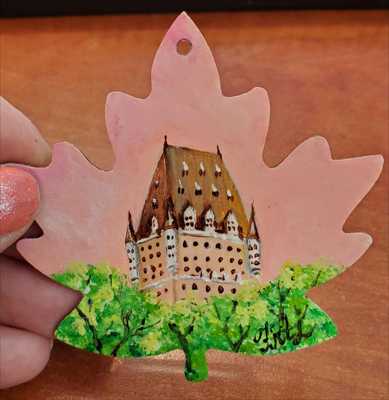 A handmade maple leaf magnet featuring Château Frontenac in a pink haze. The Château is painted with acrylics on a wood base and varnished.
