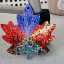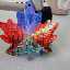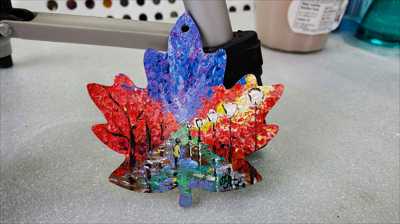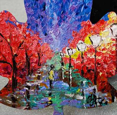 Maple leaf magnet 6 with purple sky and Quebec lanterns against a background of red foliage, painted with acrylic paints and a palette knife on a wooden base and varnished.