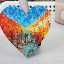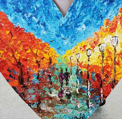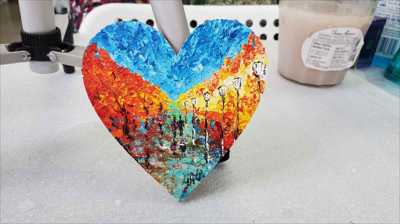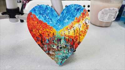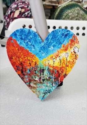 A large heart-shaped magnet painted with acrylic and a palette knife depicting autumn