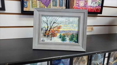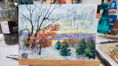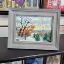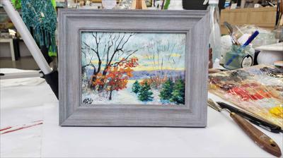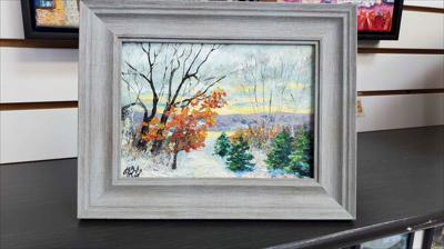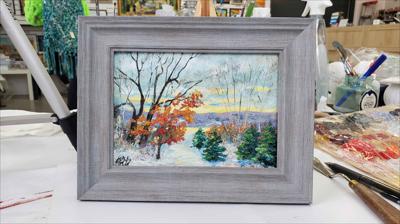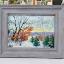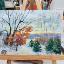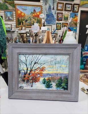 A peaceful and calm morning in Sainte-Anne-de-Beaupré, oil painting on cardboard, framed in grey.