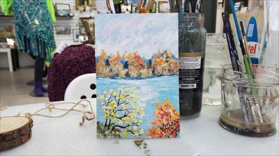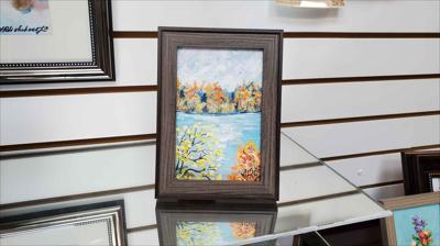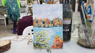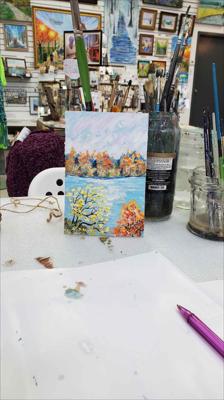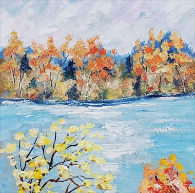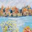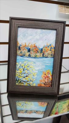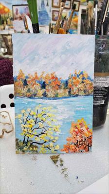 Not all the leaves have fallen yet, but the first ice has appeared on the river; the picture was painted with oil paints on cardboard and framed.