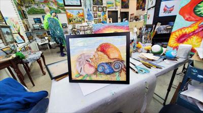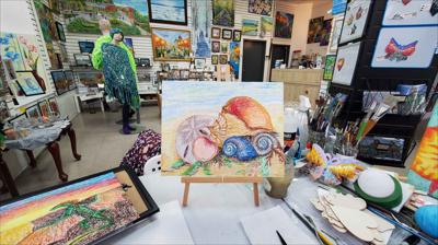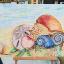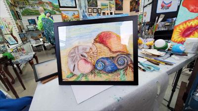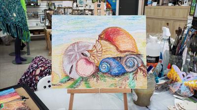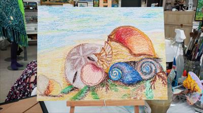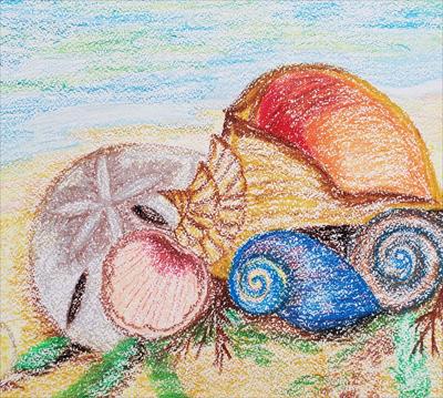 Still life of shells on a warm seashore. Oil pastel on paper.