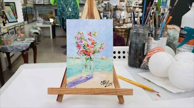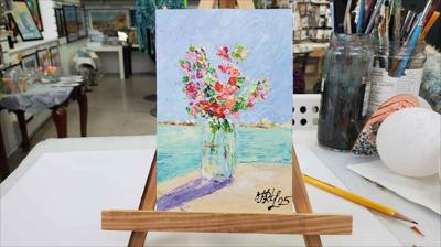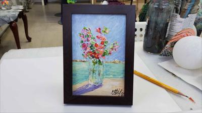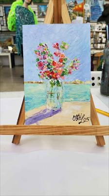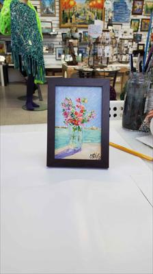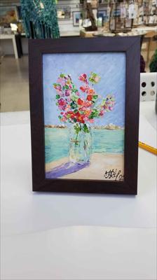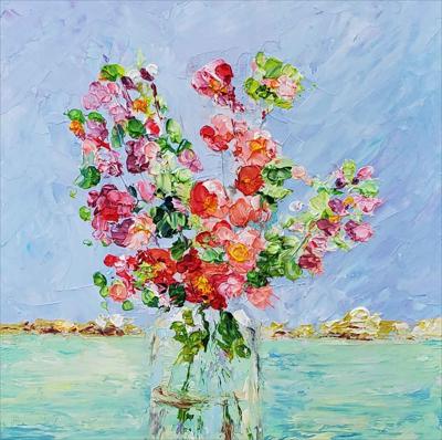 Still life. A bright, sunny summer still life. Summer flowers on a riverbank. The painting is painted with oils on cardboard and framed.